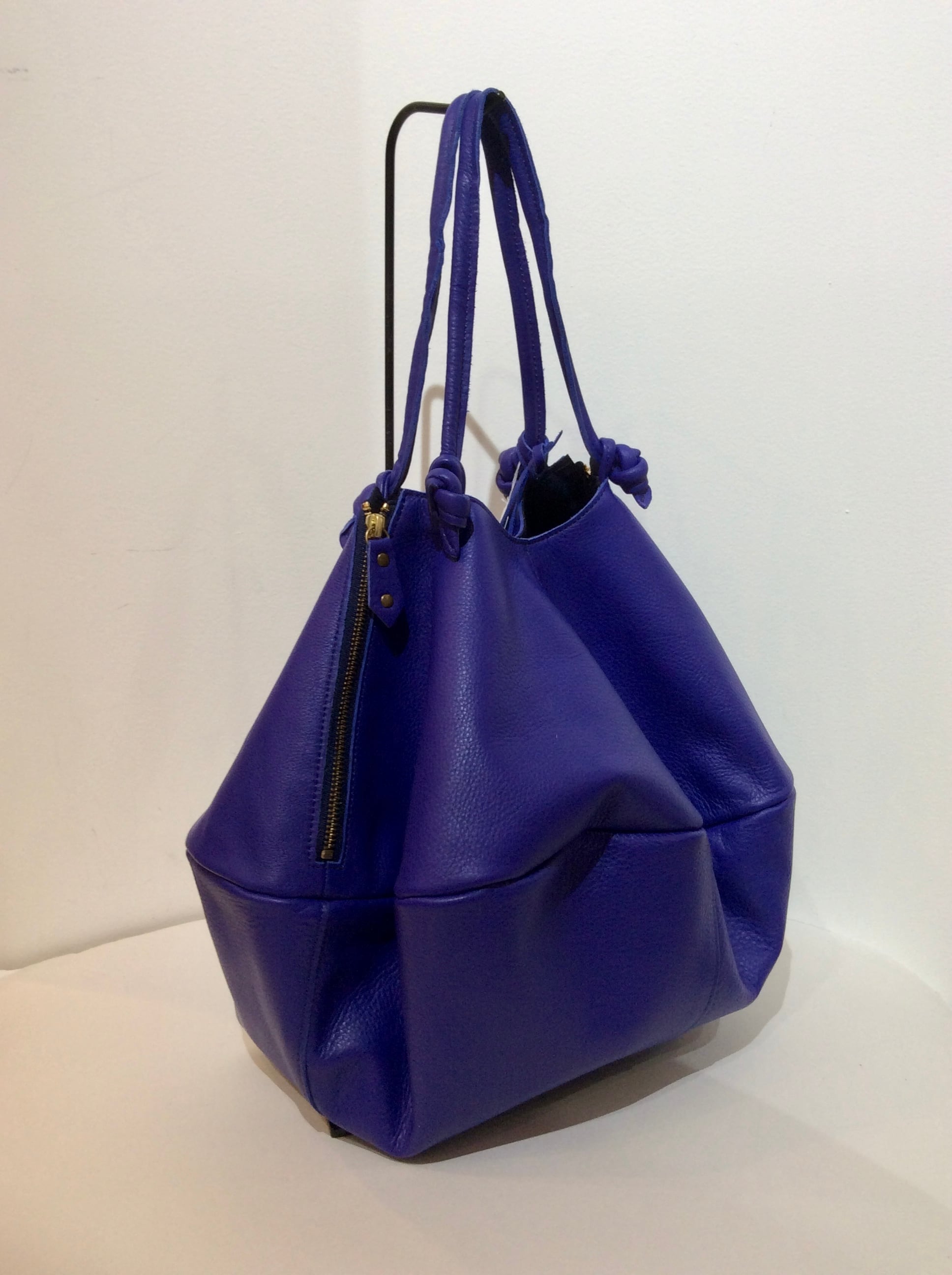 綺麗なカラーと、ユニークな形がかわいい 牛革バッグ。 物を入れて持つと、いい感じのシルエットに なるようデザインされています。 軽量でソフトです。 【サイズ】ぺたんこに置いた状態で 底の横直径52cm 縦直径47cm 紐の長さ45cm 付属 底板 ポーチ